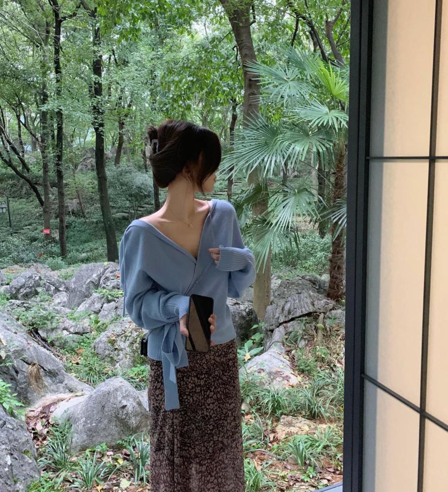 用这款蓝色针织外套,它形成的领口稍微大一点,肩部会稍微露出来。风格的演绎也很有女人味,非常适合打造成熟女人味的秋季造型。